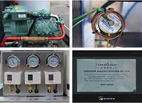 片冰機(jī)主要由壓縮機(jī)、冷凝器、膨脹閥、蒸發(fā)器等配件組成,制冰行業(yè)熟稱制冷四大件。除制冷四大件外,片冰機(jī)還有干燥過(guò)濾器、單向閥、電磁閥、截止閥、油壓表、電箱、高低壓開(kāi)關(guān)、水泵等配件。 1、壓縮機(jī),為制冰機(jī)提供動(dòng)力,是制冰機(jī)的心臟。吸入低溫低壓的汽態(tài)冷媒壓縮成高溫高壓的液態(tài)冷媒。 2、冷凝器,冷凝器有風(fēng)冷和水冷兩種,主要靠風(fēng)扇帶走多余熱量,把高溫的汽