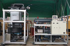 管冰機(jī)蒸發(fā)器結(jié)構(gòu):蒸發(fā)器有缸體、垂直平行的鋼管、灑水器、冰刀構(gòu)成。蒸發(fā)器頂部的導(dǎo)流器以螺旋方式將水均勻地灑到每一根鋼管里面。多余的水就被底部的水箱收集并由水泵抽回到蒸發(fā)器中。鋼管外部空間有制冷劑流動并與管內(nèi)的水發(fā)生熱交換,關(guān)內(nèi)水逐漸降溫
