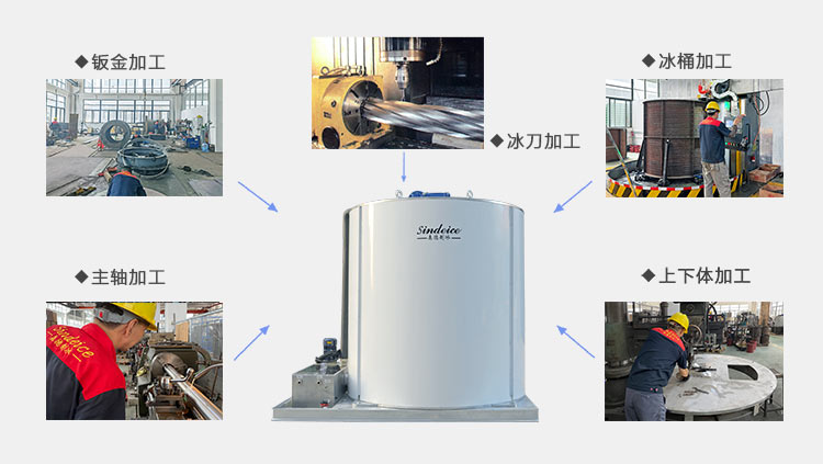 片冰機蒸發(fā)器作為片冰機蒸發(fā)產(chǎn)冰的組件,是機器產(chǎn)能及產(chǎn)冰質量最重要的部件。森德制冰具備多年的片冰機設計和生產(chǎn)制造經(jīng)驗,根據(jù)客戶的用冰需求,我工廠可單獨代工蒸發(fā)器單桶??蛻艨善ヅ渥杂械闹评錂C組,進行安裝調(diào)試,滿足生產(chǎn)需求。
